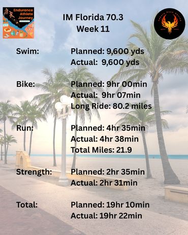 Coach Justin recaps week 11 of his Ironman Florida 70.3 training journey. He achieved his planned training volume with consistent session completion, emphasizing the importance of motivation and mental resilience throughout a high-volume schedule. Justin experimented with a new run/walk ratio, aiming to optimize recovery and performance. He discusses calculated risks in his training approach, including being intentionally undertrained for the run but overtrained for the bike and swim, and details his nutrition and equipment strategies. Personal insights reveal the challenges of balancing intense training, work, coaching, and relationships, highlighting gratitude for his wife's support. The week concluded with positive outcomes in running, cycling, swimming, and strength training, and a readiness for the upcoming rollback week to reduce fatigue and maintain progress.